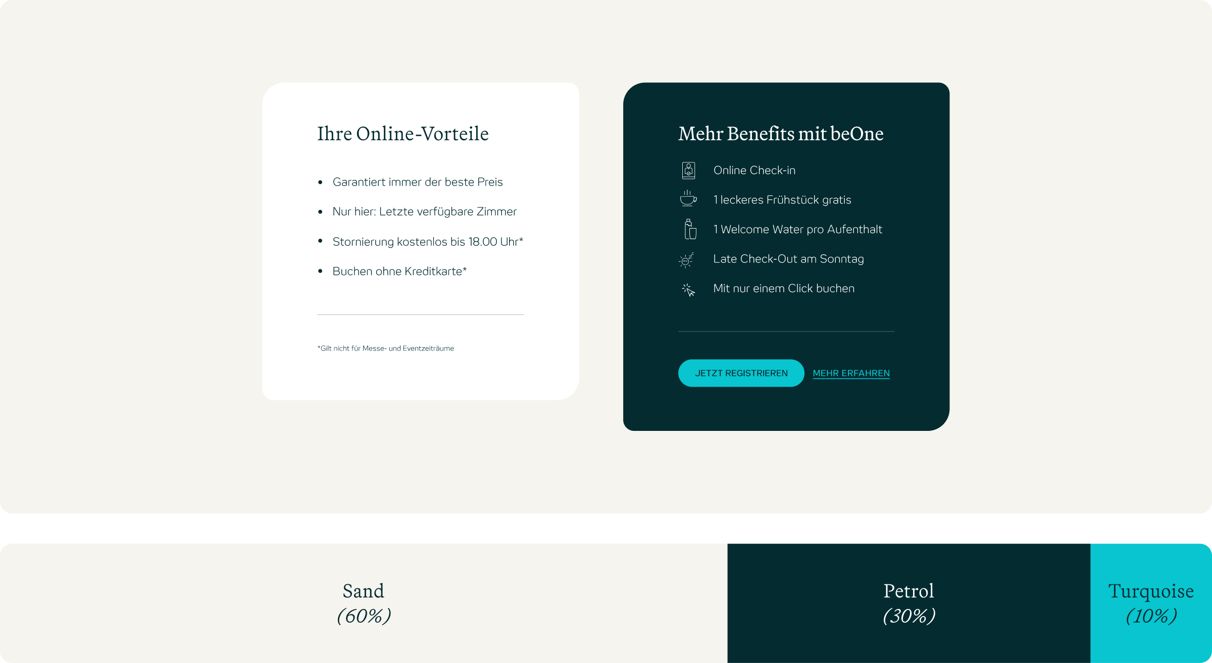 We detached turquoise from price communication and defined it as the brand’s anchor, ensuring recognition across all touchpoints, contrasted by petrol and softened with the warmth of sand.